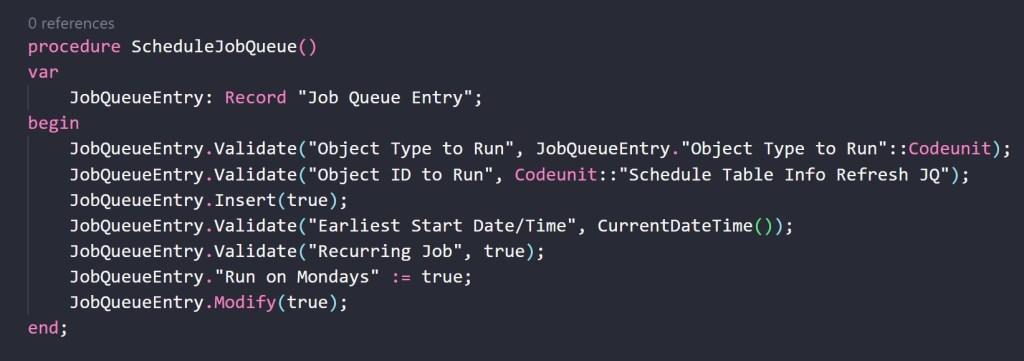 This procedure schedules a codeunit (here I’ve used a standard codeunit just for simplicity) as a recurring job queue task.