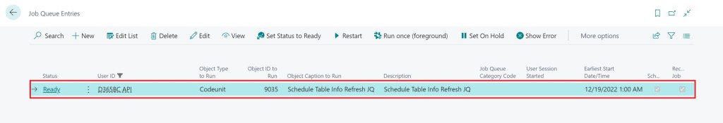 If you go on Dynamics 365 Business Central and you check the Job Queue Entries page, you can see that a Job Queue Entry record is created: