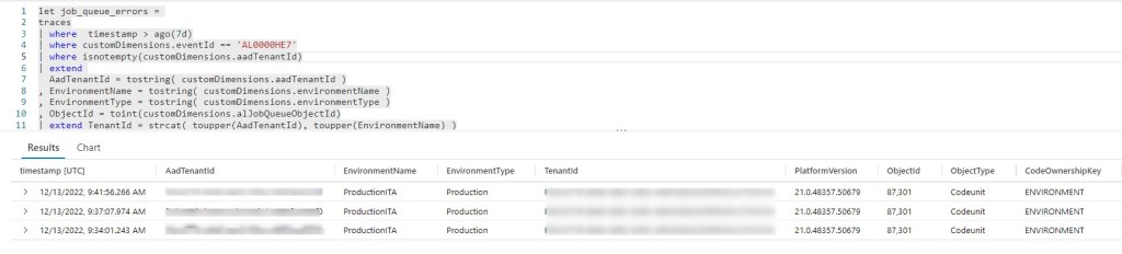 My KQL query that shows the failed job queue tasks on my Dynamics 365 Business Central tenant gives the following output: