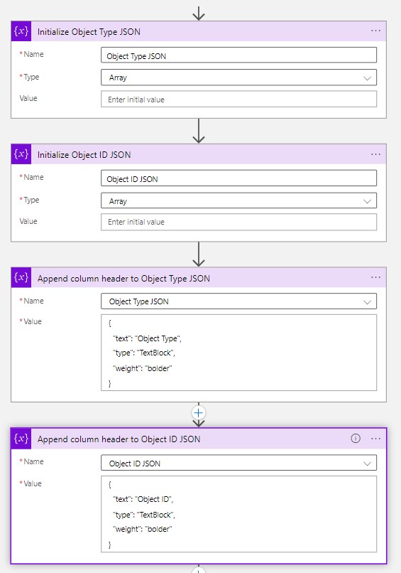 In this workflow I’m initializing 2 array variables and to each variable I append the column definition in JSON format accordingly to the Adaptive Card column format (first row of the ColumnSet) using the Append to array variable action: