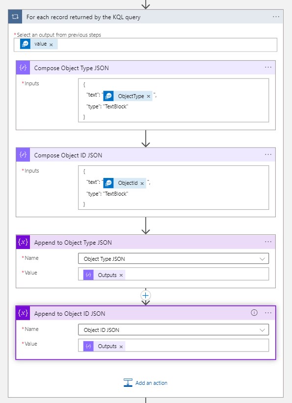 Now for each records returned by the KQL query on my Azure Application Insights instance, I use the Compose action for creating the TextBlock object for each returned value. On each TextBlock I’m dynamically passing the KQL field to display (ObjectType and ObjectId fields returned by the KQL query):