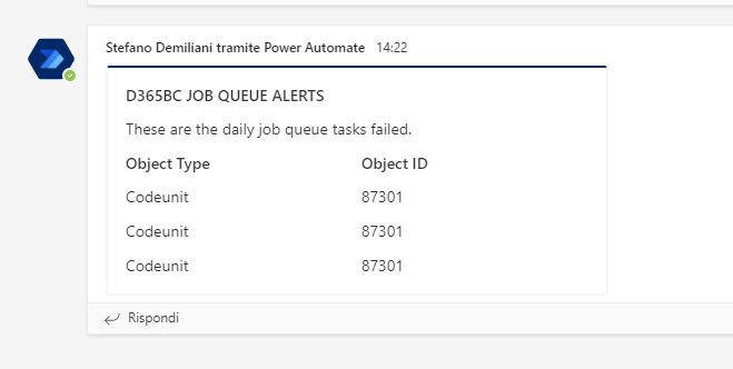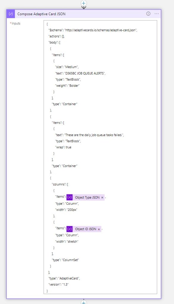 and I would like to send on Teams an Adaptive Card showing a table listing the Object Type and Object Id of the job queue tasks failed.