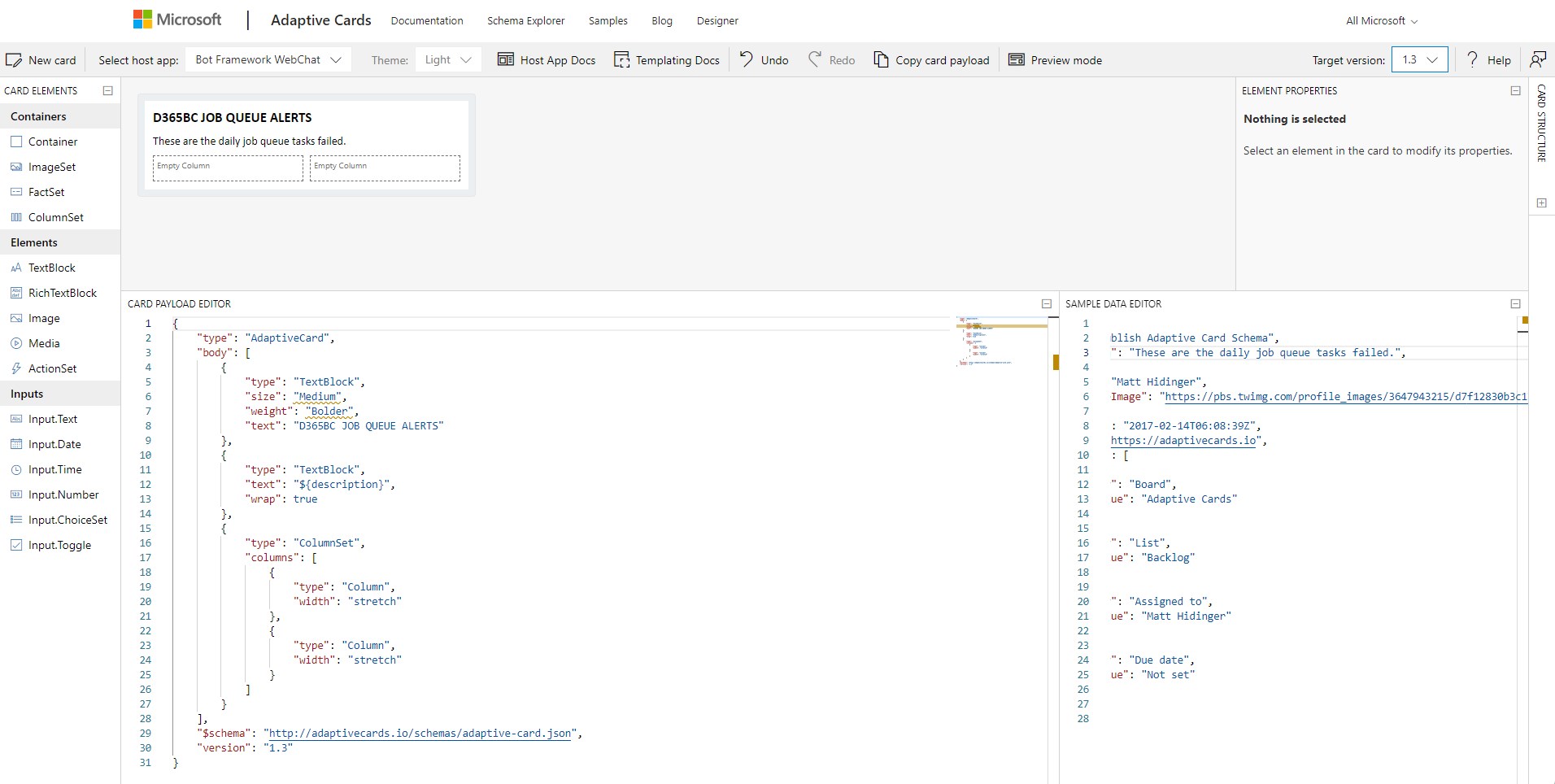 To design an Adaptive Card and discover how the JSON is composed (various building blocks etc) I suggest to go to https://adaptivecards.io/designer/ and start creating. Here I’ve created a simple Adaptive Card with a ColumnSet of 2 columns: