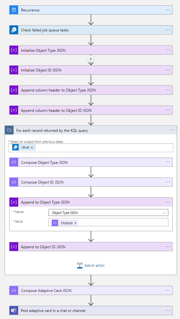 and I would like to send on Teams an Adaptive Card showing a table listing the Object Type and Object Id of the job queue tasks failed.