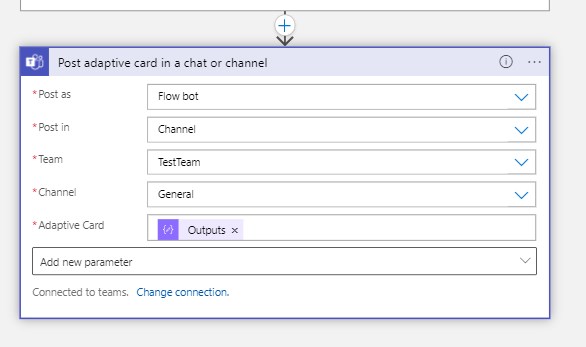 In the last workflow step, I use the Post adaptive card in a chat or channel action of the Teams connector for sending the Adaptive card to my Teams channel: