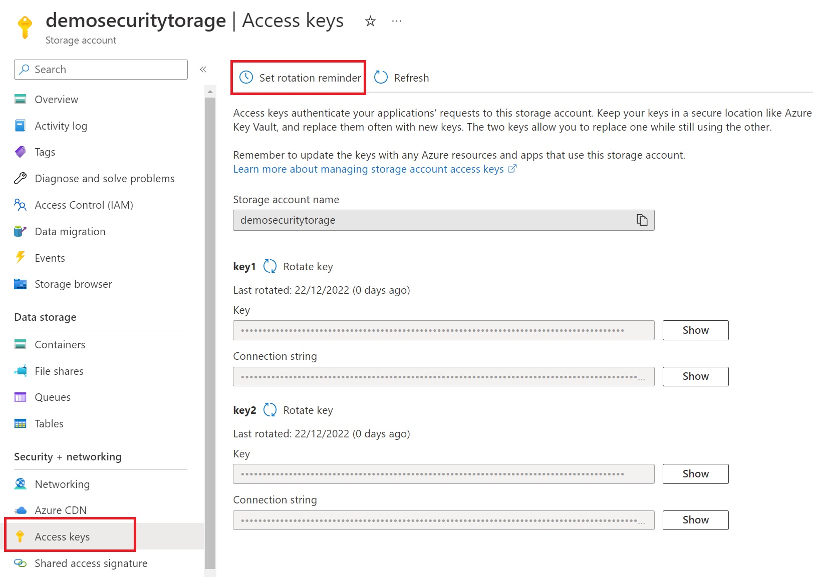 To do that, you can select the Access keys blade and then click on Set rotation reminder:
