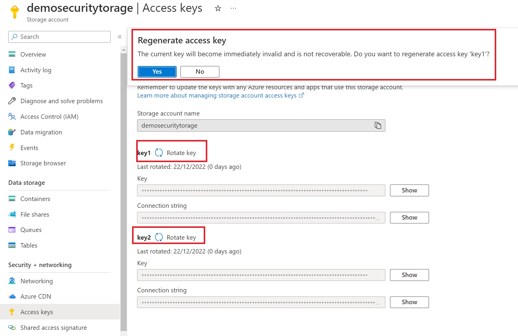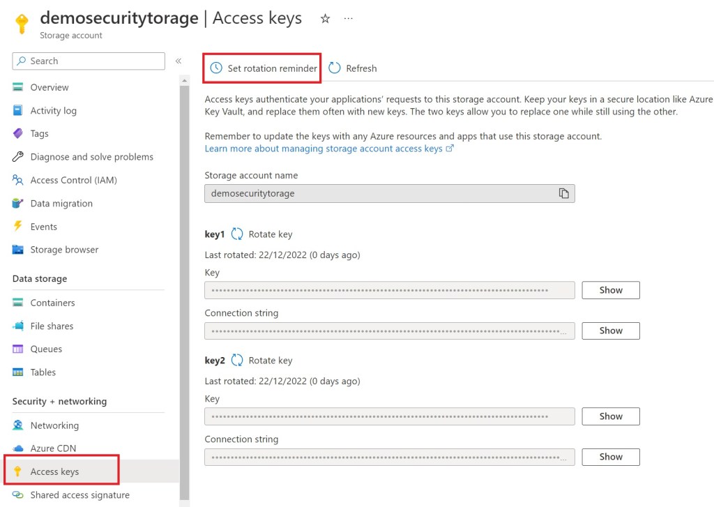 To avoid having compromised keys, it’s recommended to periodically rotate those access keys. A key expiration policy enables you to set a reminder for the rotation of the account access keys. The reminder is displayed if the specified interval has elapsed and the keys have not yet been rotated. After you create a key expiration policy, you can monitor your storage accounts for compliance to ensure that the account access keys are rotated regularly.