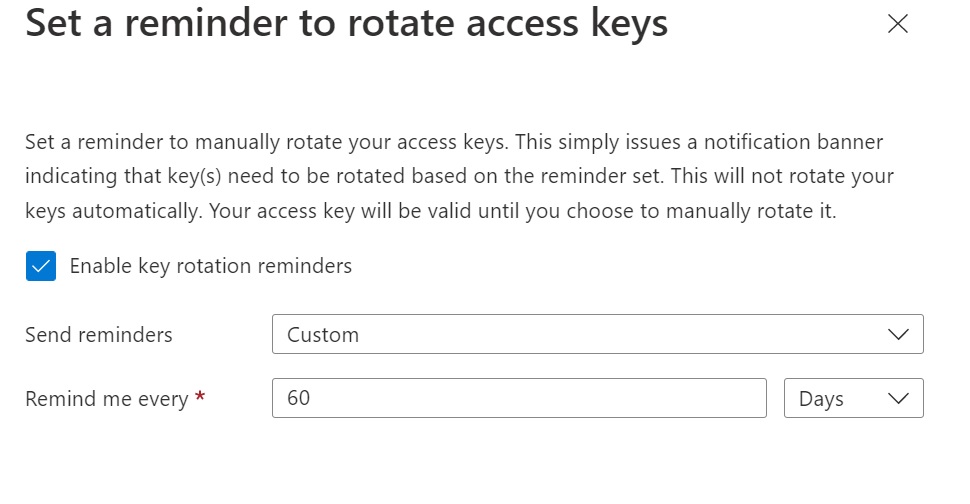 In Set a reminder to rotate access keys, select the Enable key rotation reminders checkbox and set a frequency for the reminder: