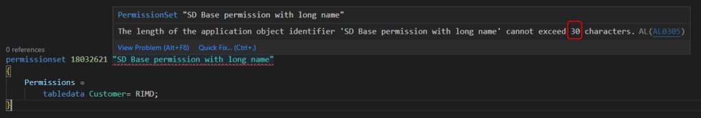 AL permission sets name length check has a sneaky behaviour in Visual Studio Code. Let’s create a simple permission set like the following: