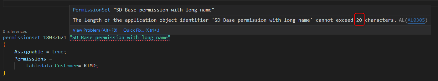 AL permission sets name length check has a sneaky behaviour in Visual Studio Code. Let’s create a simple permission set like the following:
