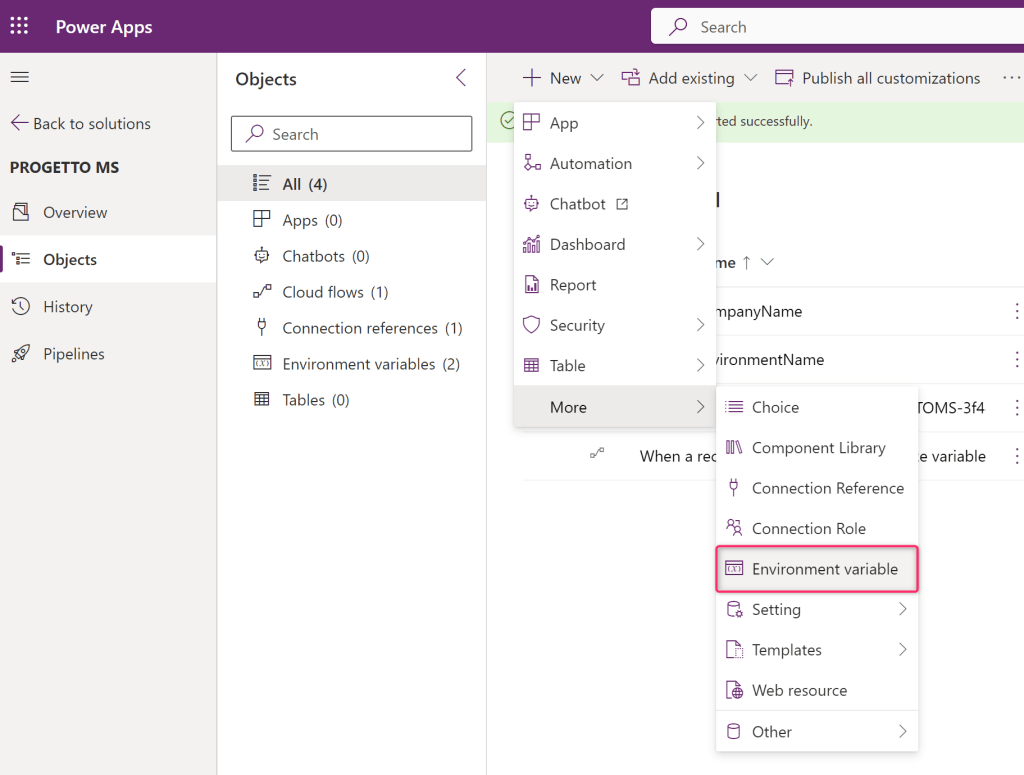 To use environment variables with the Dynamics 365 Business Central connector for Power Automate, you need to first create a Solution in your Dataverse environment (you can’t use/access environment variables in a flow which is not in a solution). When the solution is created, go into your solution and on the command bar, select New > More, and then select Environment variable: