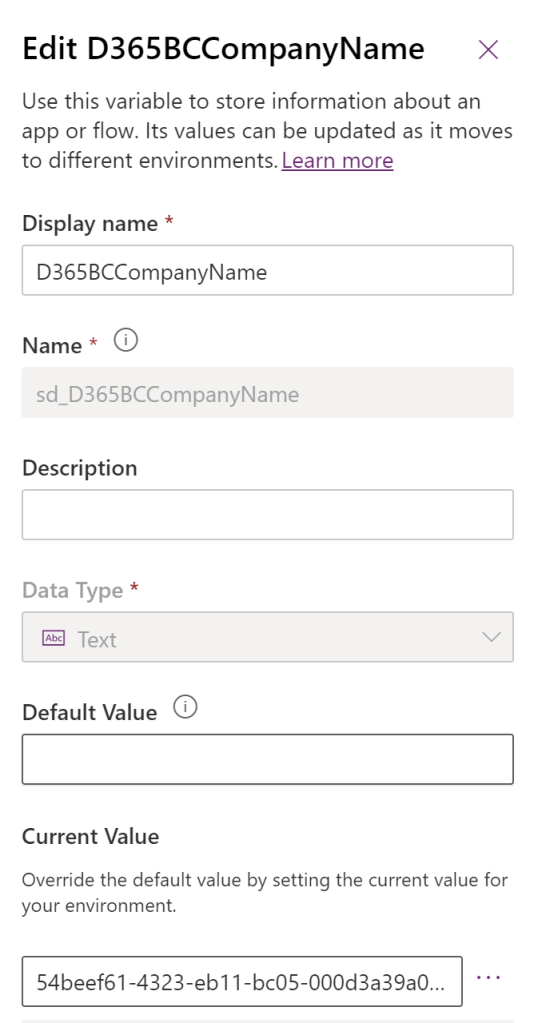 • D365BCEnvironmentName: contains the Dynamics 365 Business Central environment name