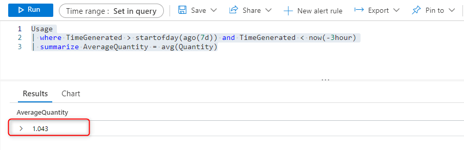 Usage | where TimeGenerated > startofday(ago(7d)) and TimeGenerated < now(-3hour) | summarize AverageQuantity = avg(Quantity)