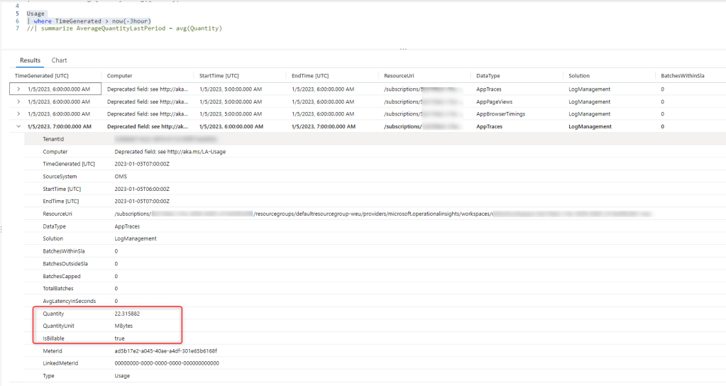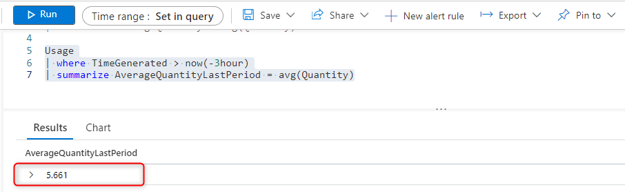 Usage | where TimeGenerated > now(-3hour) | summarize AverageQuantityLastPeriod = avg(Quantity)