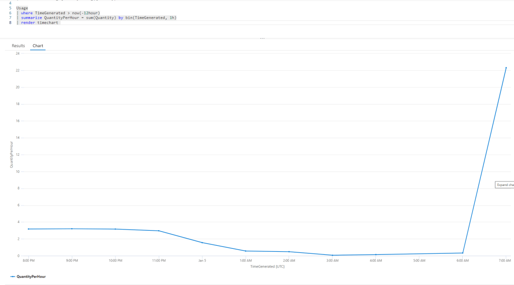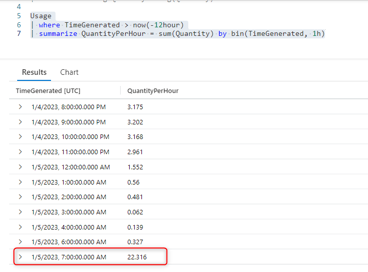 Usage | where TimeGenerated > now(-12hour) | summarize QuantityPerHour = sum(Quantity) by bin(TimeGenerated, 1h)