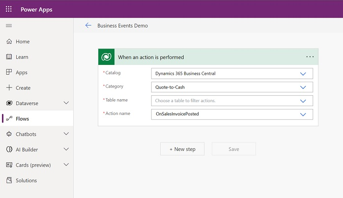- you can now create a flow by using the Dataverse connector and use the When an action is performed trigger to select the Dynamics 365 Business Central catalog, a category (for example Quote-to-Cash) and and action/business event on that category (for example OnSalesInvoicePosted), so that the flow will be triggered whenever a sales invoice is posted: