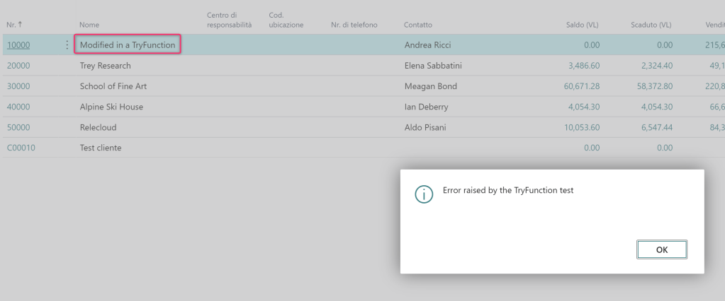 My Customer record is modified, despite the error. This is why you should avoid write transactions inside a TryFunction.