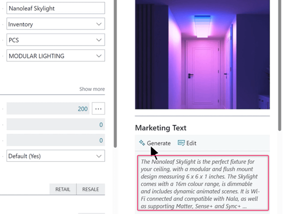 Copilot in Dynamics 365 Business Central streamlines the creation of product listings for online commerce. Product attributes such as color, material and size can be used to create compelling product descriptions for online storefronts in seconds. The descriptions can be further tailored by choosing tone of voice, format and length. Business Central customers using Shopify can seamlessly publish the products with descriptions to their Shopify store in just a few clicks.