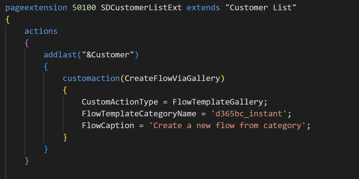 For integrating Power Automate flows in Dynamics 365 Business Central pages, two new customaction types are introduced: FlowTemplate and FlowTemplateGallery.