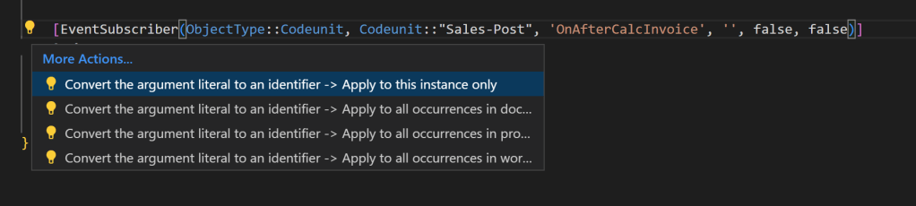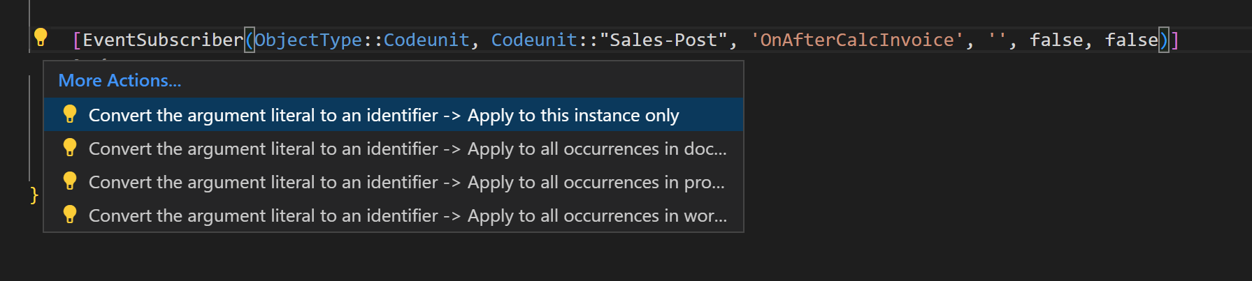 In order to facilitate the conversion, code actions have been introduced to convert one, some, or all event subscribers in your project or workspace to the new syntax: