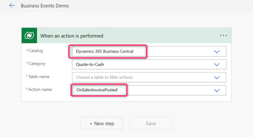 In the Dataverse connector, you can select the When an action is performed trigger and here select Dynamics 365 Business Central as catalog, select the event category and then the event name:
