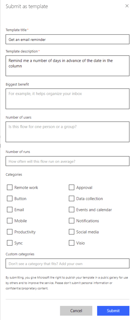 Remember that when you submit a flow as a template, you can specify a pre-defined category or you can create your custom categories: