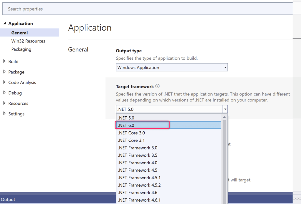 Updating your applications to target the latest version of .NET is easy if you already are on .NET Core or .NET 5. If you’re in this case, in Visual Studio, simply right click on your project in Solution Explorer and choose Properties. Under Application > General > Target framework, choose .NET 6.0: