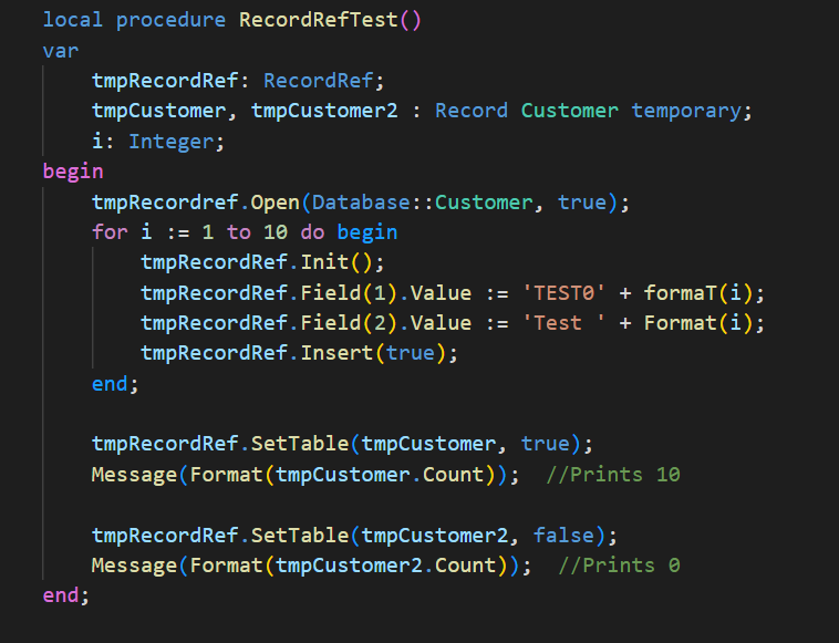 The code creates a temporary RecordRef variable pointing to the Customer table, then it creates 10 temporary Customer records on it.