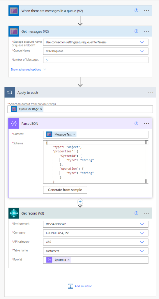 Then, the Power Automate (or Logic Apps) workflow started from the “When there are messages in a queue” trigger: