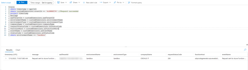 traces | where timestamp > ago(1d) | where customDimensions.eventId == 'AL0000I74' //Request succeeded | project timestamp , message , aadTenantId = customDimensions.aadTenantId , environmentName = customDimensions.environmentName , environmentType = customDimensions.environmentType , companyName = customDimensions.companyName , requestStatusCode = customDimensions.alStatusCode , functionHost = customDimensions.alFunctionHost , eventName = customDimensions.alEventName , statusCode = customDimensions.alStatusCode