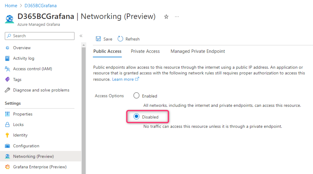 When you create an Azure Managed Grafana instance, public access is enabled by default (you can then create users and assign roles). If you want to use private endpoints and disable public access, you first need to open your Azure Managed Grafana instance and under Settings, select Networking (Preview). Here under the Public Access tab you can disable public access to the instance: