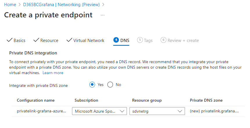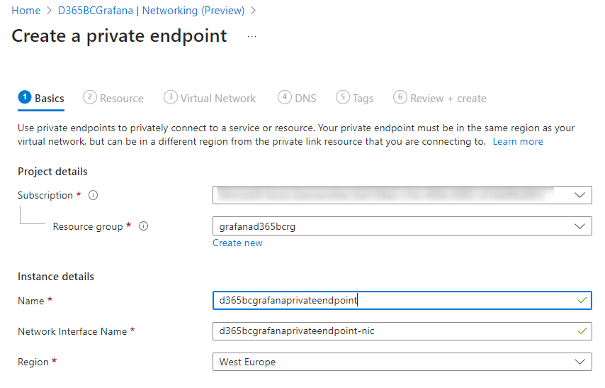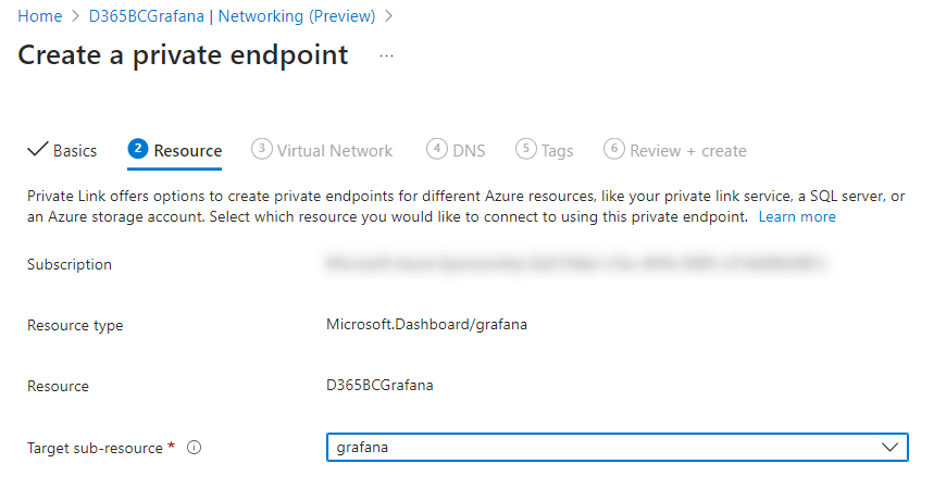 In the Resource tab, you can specify the target Azure resource. The resource type Microsoft.Dashboard/grafana and the target sub-resource grafana indicate that you’re creating an endpoint for an Azure Managed Grafana workspace: