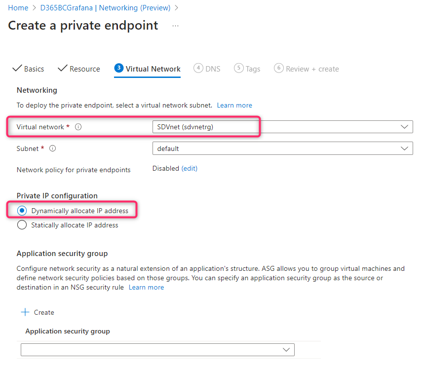 In the Virtual Network tab you can select or create a Virtual network to deploy the private endpoint to: