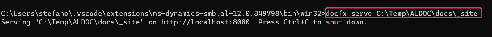 C:\Users\stefano\.vscode\extensions\ms-dynamics-smb.al-12.0.849798\bin\win32\\aldoc.exe build -o "C:\Temp\ALDOC\docs" -c "C:\Temp\ALDOC\apps" -s "C:\Temp\ALDOC\apps\SD_Azure Functions Module Demo_1.0.0.0.app"