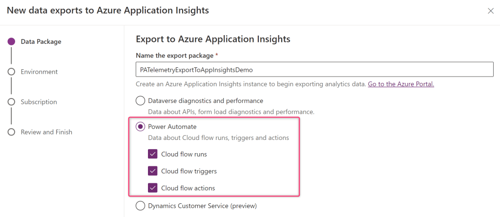 In the New data exports to Azure Application Insights window, select the name of the export package (I suggest to include the name of the Azure Application Insights instance on it), then select Power Automate and select whether to export cloud flow runs, triggers, and/or actions: