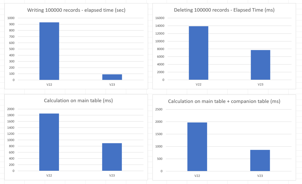 The number clearly say that Dynamics 365 Business Central 2023 Wave 2 release (version 23) is absolutely a lot more fast on reading and writing bulk amount of data. The new data structure for companion tables helps on reducing the number of tables to fill when a record is created or to empty when a record is deleted. The new data structure also helps on reducing the number of joins, so the underlying SQL queries are much faster.
