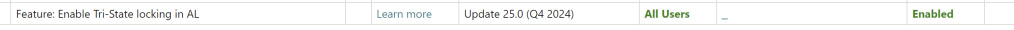 The tri-state locking feature key can be enabled/disabled via the Feature Management page (check for Enable Tri-State locking in AL). It affects the entire environment and is first enabled from the next session: