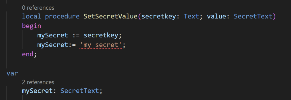 Dynamics 365 Business Central 2023 Wave 2 release (version 23) and the new AL language version 12 introdocues a new data type called SecretText. This new data type can be used to protect secrets in AL code from being revealed through debugging.