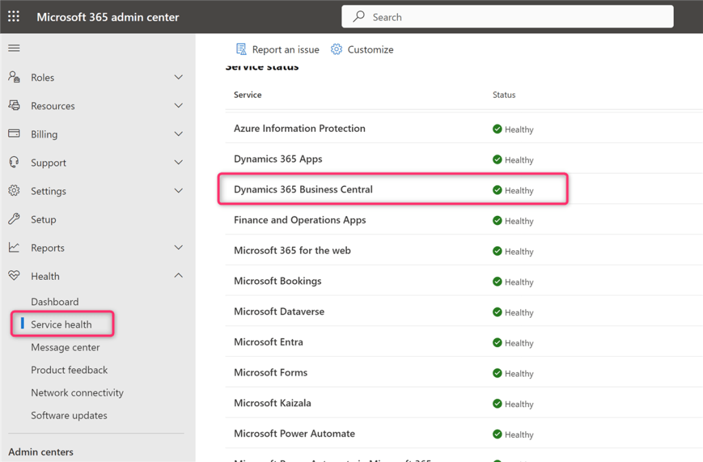 Service incidents are always communicated through Service Health Dashboard in the Microsoft 365 Admin Center portal (https://aka.ms/admincenter) and then also embedded in the Dynamics 365 Business Central Admin Center. You can access the Service Heath Dashboard from the following menu: