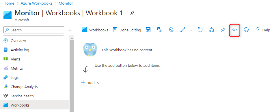 In the workbook creation page, open the Advanced Editor using the </> button on the toolbar: