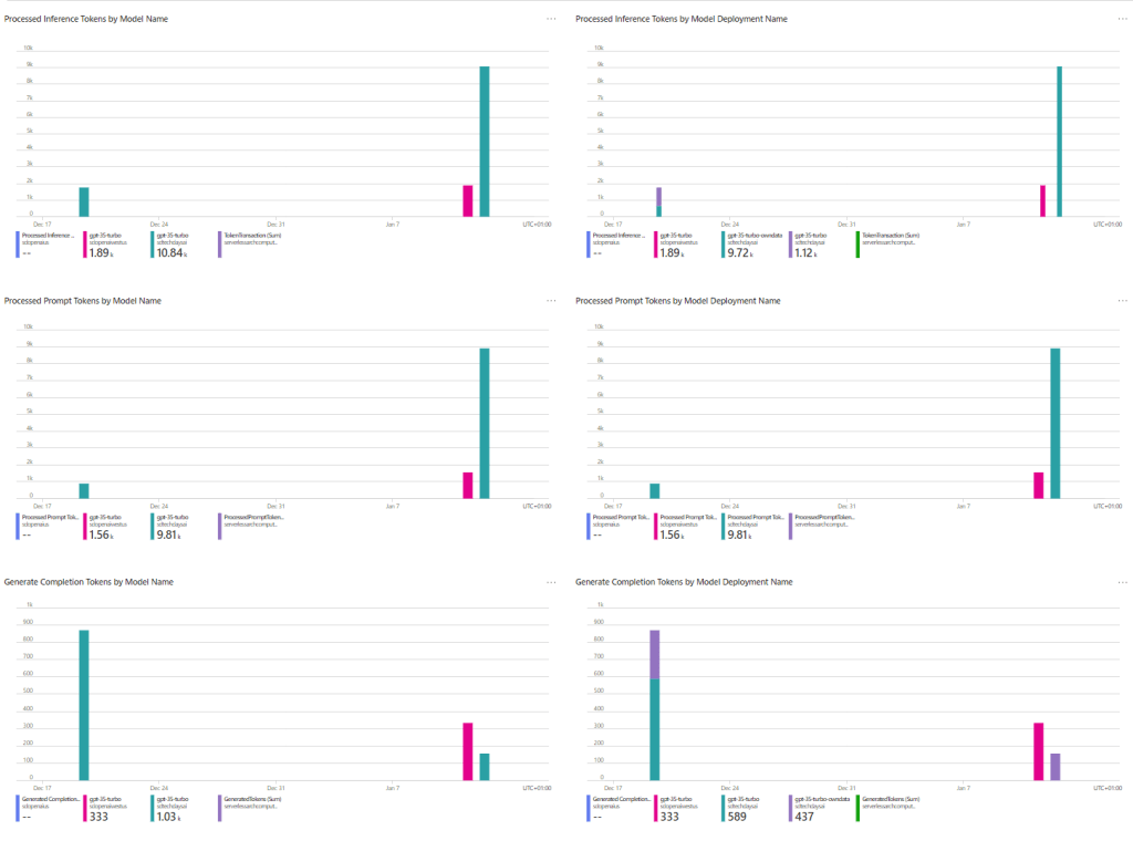 - Token based usage – multiple metrics: Processed Inference Tokens, Processed Prompt Tokens, Generate Completions Tokens, Active Tokens; these are displayed with couple of dimensions such as, model name and model deployment name.
