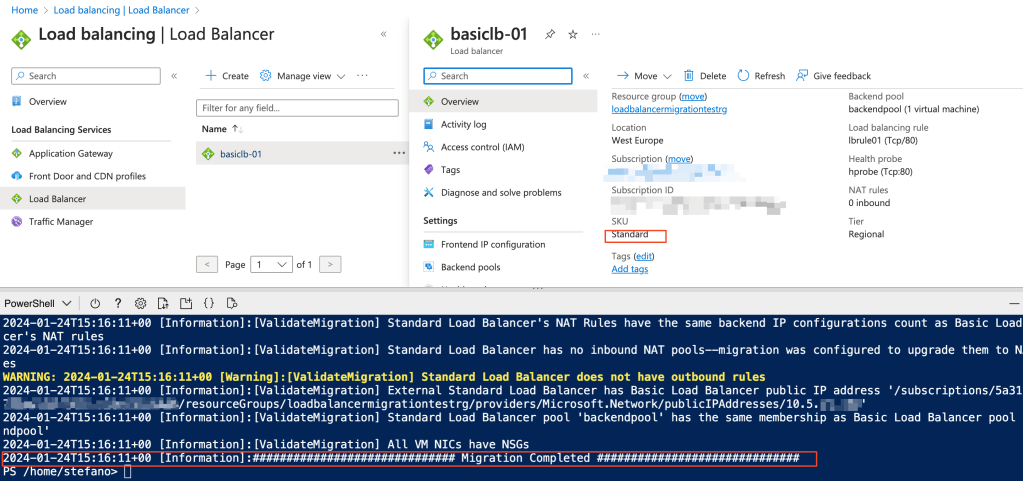 The command makes a backup of the roles and configuration of your Basic Load Balancer and deletes it. Then it creates a new Standard Load Balancer SKU and applies to it your original roles and configurations.