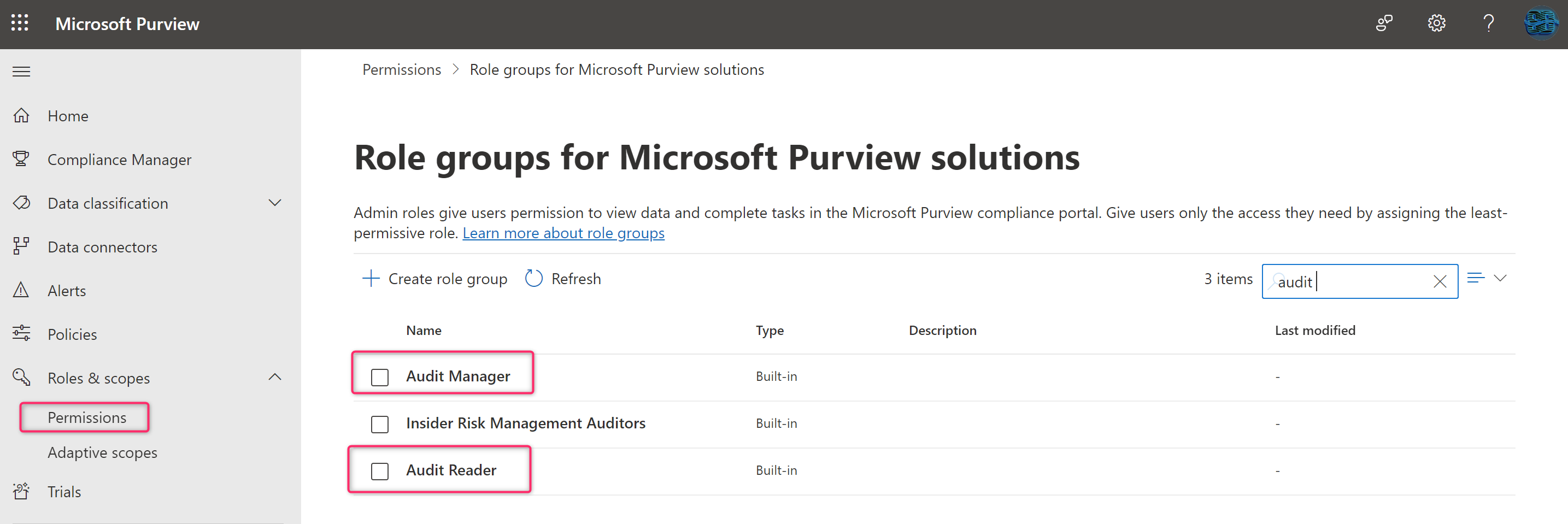 Admins and members of investigation teams must be assigned the View-Only Audit Logs or Audit Logs role in the compliance portal to search or export the audit log. By default, these roles are assigned to the Audit Reader and Audit Manager role groups on the Permissions page in the complance portal: