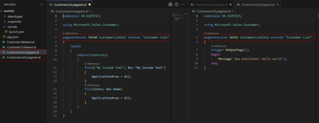 That now you can create multiple extension objects of the same target in your extension. For example, in an extension you can now create two tableextension objects for the Customer table: