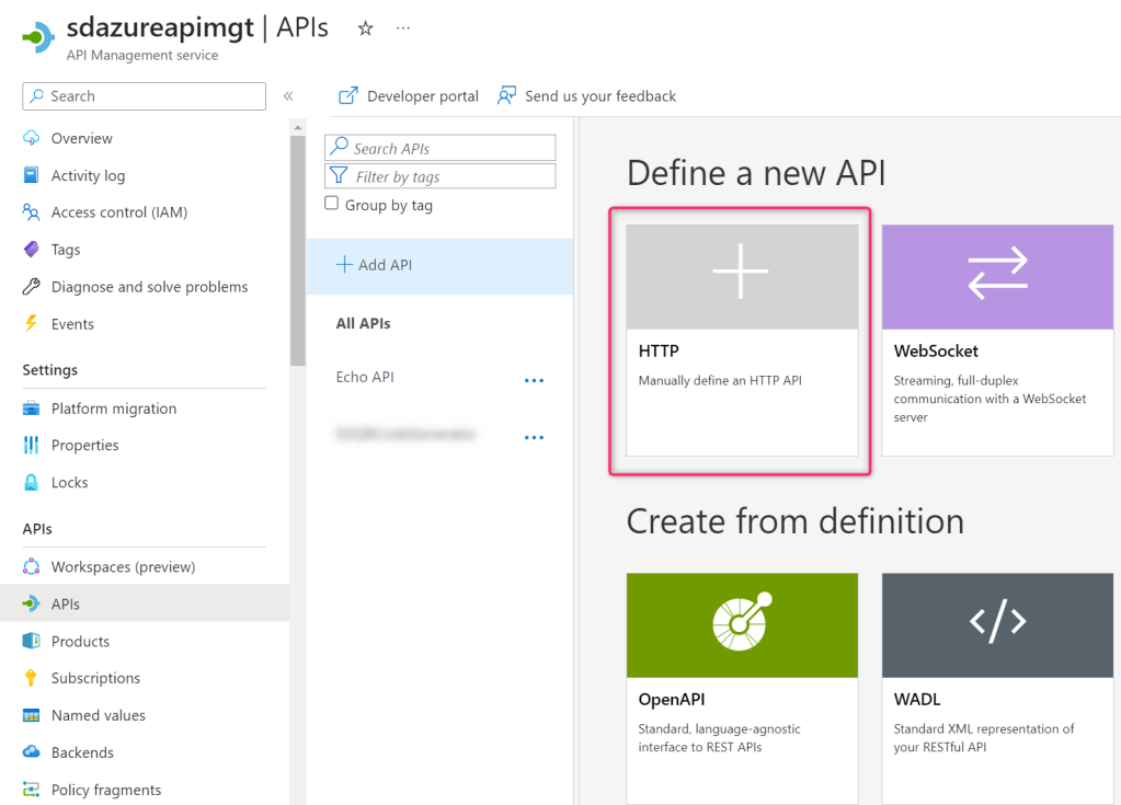 When the Azure API Management service is provisioned, select APIs and then add a new API by selecting the manual definition (HTTP):