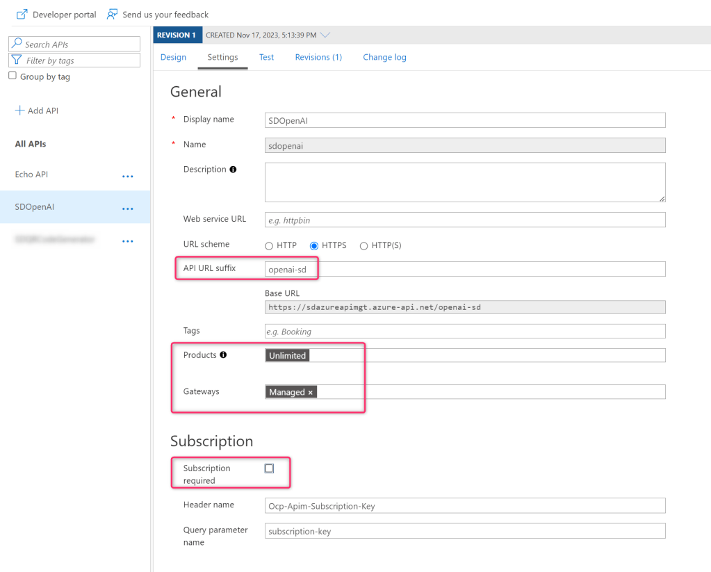- Specify an API URL suffix (it will make your endpoint unique for Azure OpenAI).