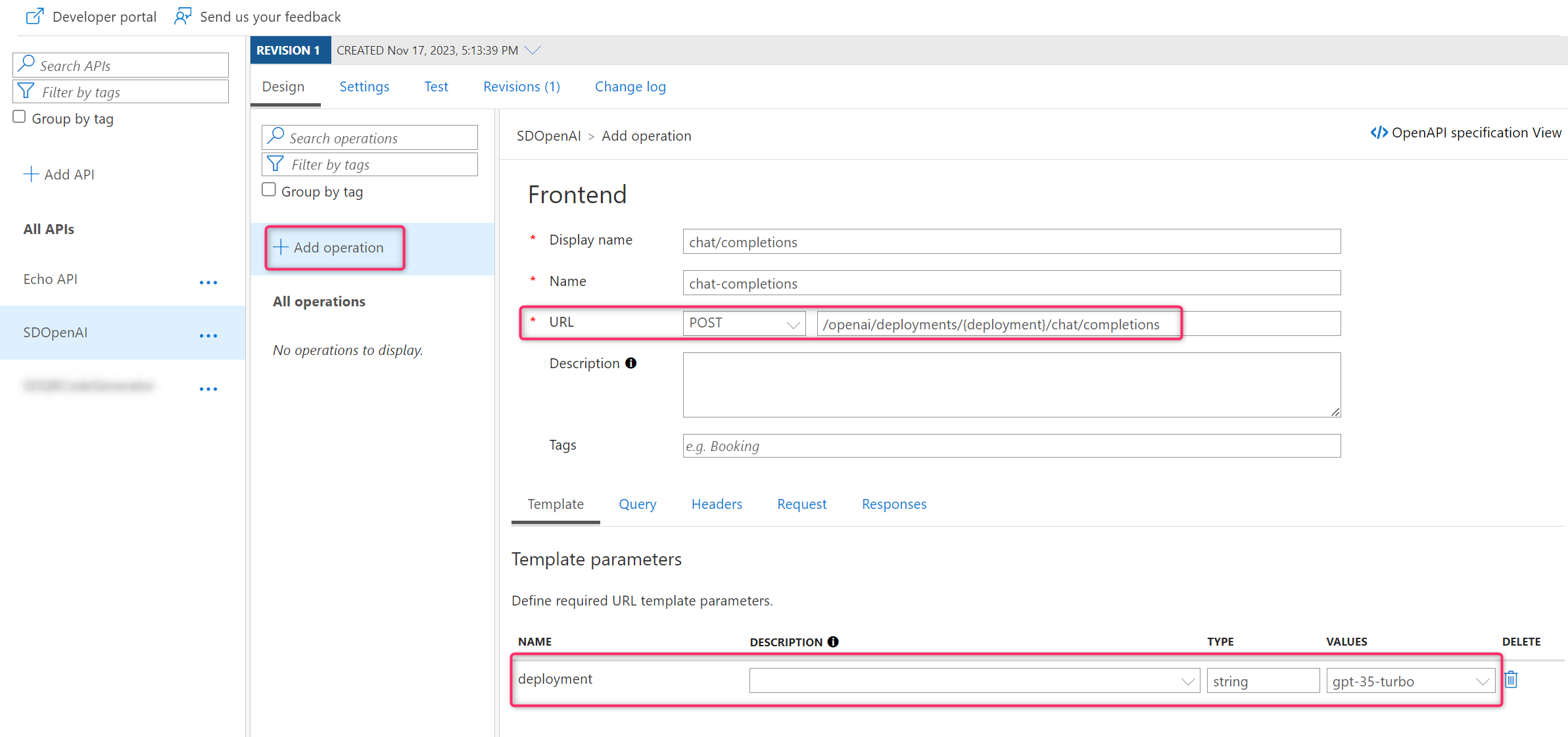 From your API definition, under the Design tab select Add operation. Here we need to define the methods of our APIs. Here I want to insert into Azure API Management a “wrapper” for calling the Azure OpenAI Chat completions API (API that creates chat competions for prompts with the GPT-35-Turbo and GPT-4 models). This API can be invoked by sending a POST request to the following Azure OpenAI endpoint: