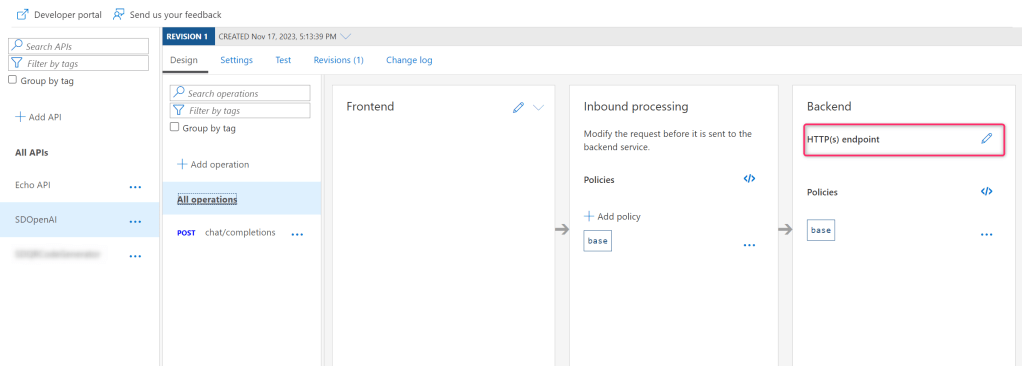 When the backend is created, we have defined a “bridge” between our Azure API Management instance and the real Azure OpenAI endpoint. In my scenario here, this means that to call the Azure OpenAI Chat Completions API, instead of sending a POST request to the following direct URL:
