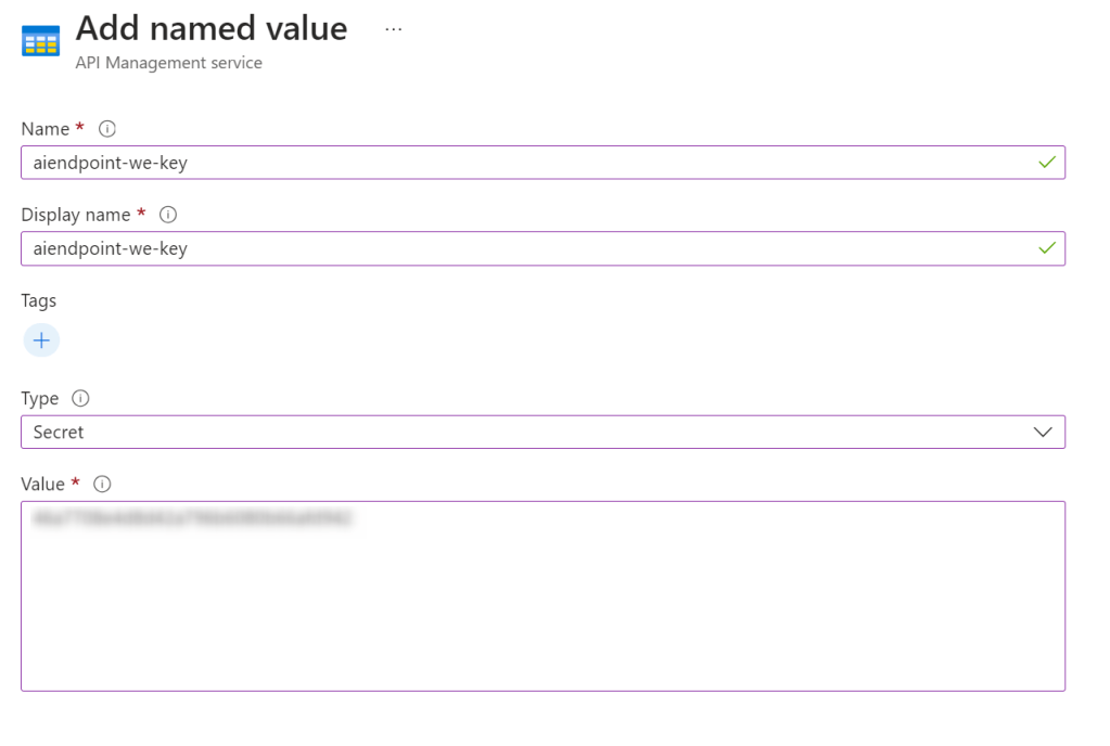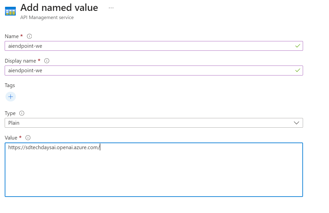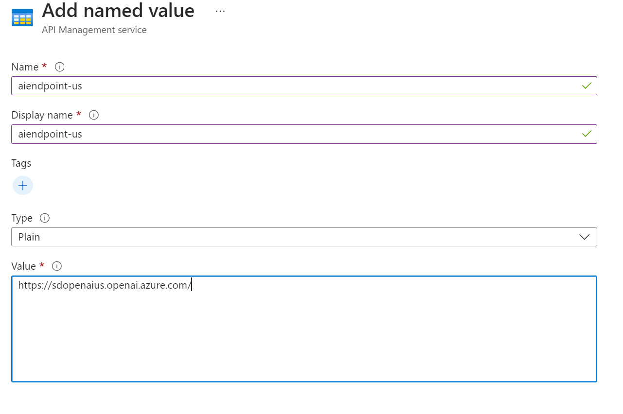 Here I’ve created a named value called aiendpoint-we (Type = Plain text) containing the endpoint of my first Azure OpenAI instance (located in Western Europe). Then I repeat the same for the second Azure OpenAI instance (in my case it’s located in East US):