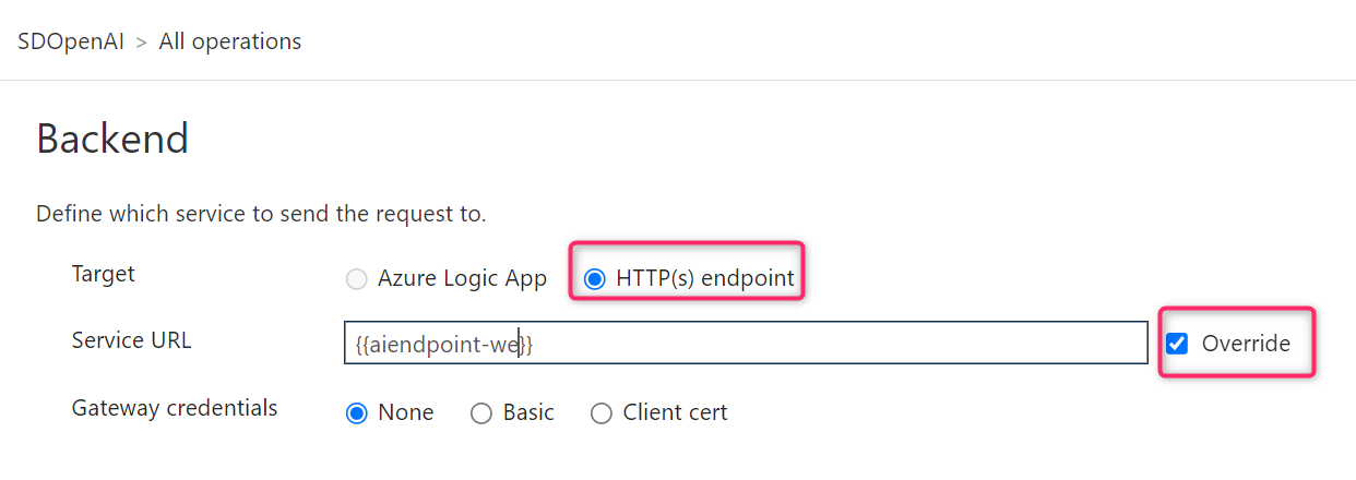Here is where we define the Azure OpenAI API endpoints to call. Set Target = HTTPS and Service URL = url your Azure OpenAI endpoint. Check also the Override flag (see image below):
